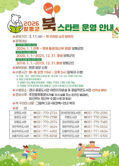 북스타트 사업은 양평군이 주관하고 북스타트코리아가 후원하는 독서문화 확산 사업으로, 관내 임신부와 영유아, 초등학교 2학년 이하 아동을 대상으로 그림책이 담긴 가방(책 꾸러미)을 지원하는 프로그램이다.