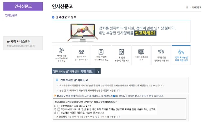 ‘간부 모시는 날’로 피해를 입은 국가공무원은 게시판을 통해 익명으로 신고할 수 있으며, 본인뿐 아니라 제3자도 제보가 가능하다.