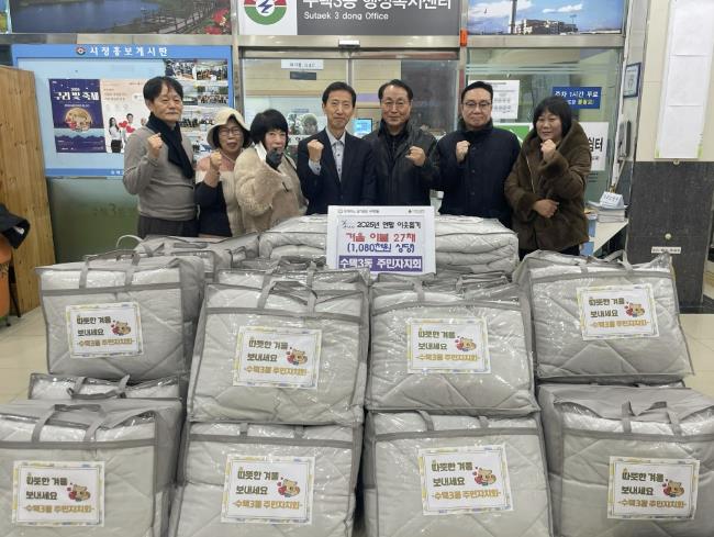 이번 후원 물품은 수택3동 주민자치회가 주관해 마련한 것으로, 지난 10월에 열린 제7회 장자못축제에서 운영된 주민자치센터 체험 부스 수익과 자치회 환경복지 분과 사업인 ‘아나바다 행사’의 수익금을 활용해 준비됐다.