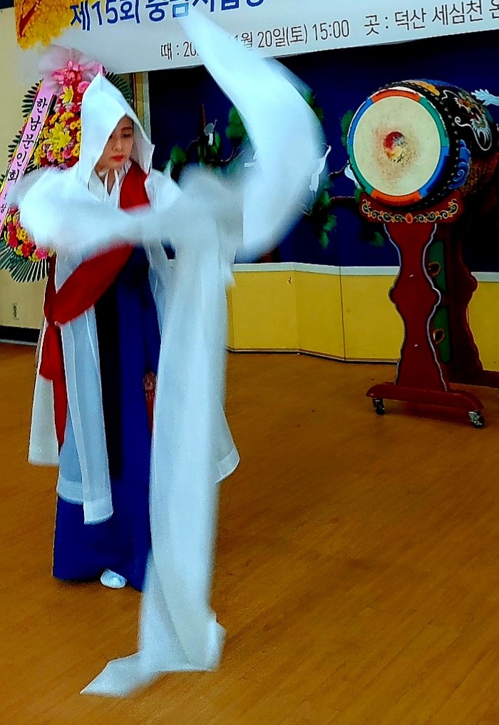 의상은 남색치마에 힌 저고리 머리엔 힌 고깔