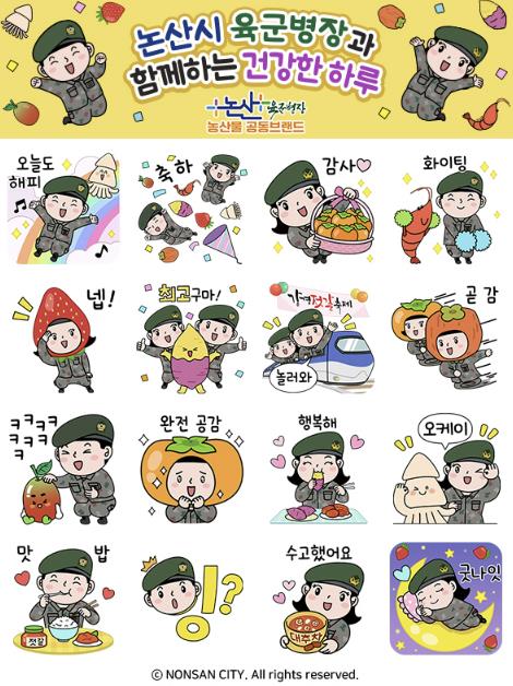 ‘논산시 육군병장과 함께하는 건강한 하루’라는 주제로 제작된 이모티콘은 논산시 농산물 공동브랜드 마스코트 ‘육군병장’과 딸기, 대추, 고구마, 젓갈, 곶감 등 지역 대표 농특산물을 소재로 제작됐다. 일상 대화 속에서 친근하고 재치 있게 사용할 수 있는 디자인을 통해 논산의 건강한 농특산물을 자연스럽게 홍보할 수 있는 것이 특징이다.