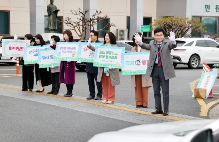 새학기 준비로 수고한 직원을 응원하기 위해 '우리 함께', '토닥토닥' 등의 문구와 '차별 없이, 존중 가득' 등 양성평등 메시지가 담긴 피켓으로 출근하는 직원을 맞이했다.