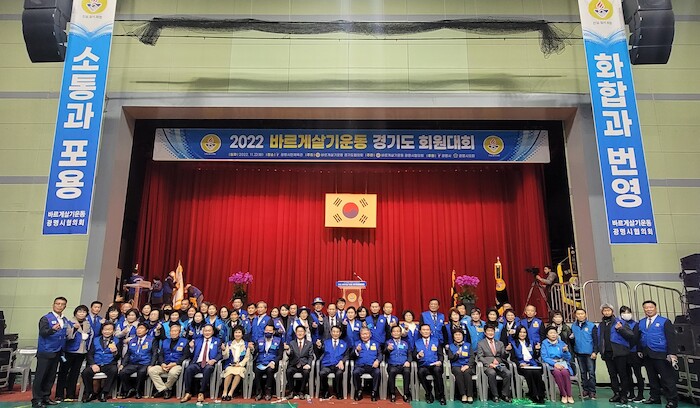 | ▲22일 광명시민체육관에서 열린 바르게살기운동 경기도회원대회에서 기념촬영을 하고 있다. |