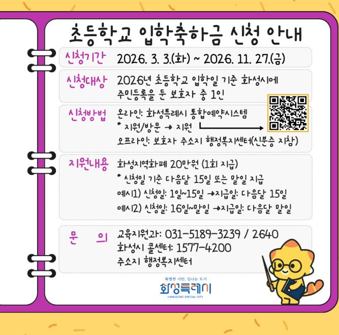 [세계로컬타임즈] 화성특례시는 2026학년도 초등학교 1학년 입학생을 대상으로 ‘초등학교 입학축하금 지원사업’을 시행한다.
