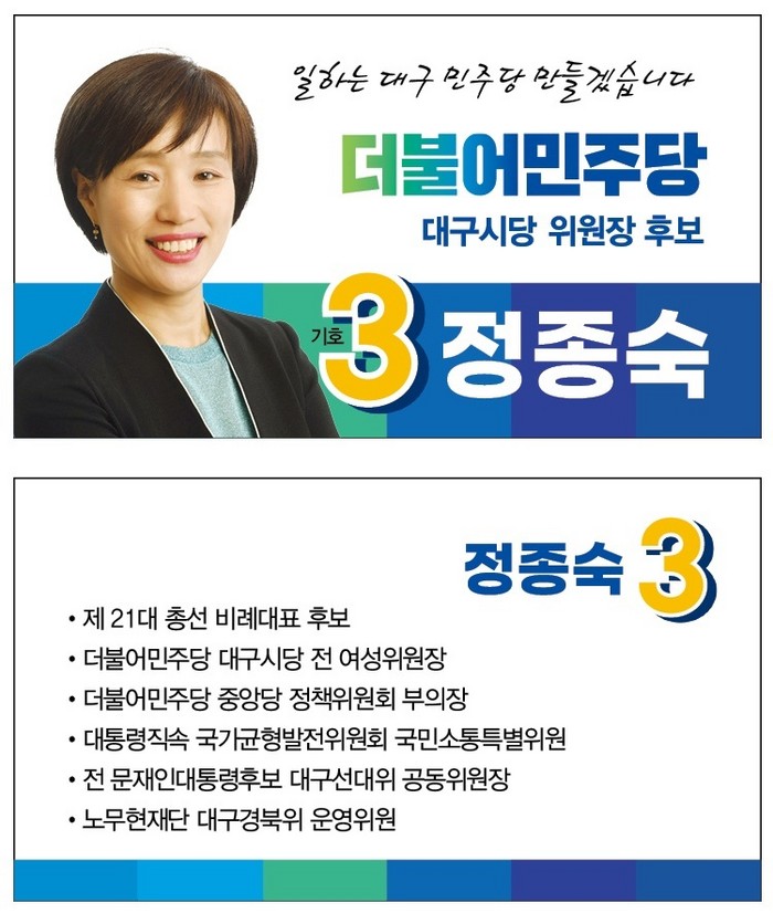 기호 3번 정종숙 후보는 ‘일하는 대구 민주당을 만들겠다’라는 캐치프레이즈를 내세웠다.
