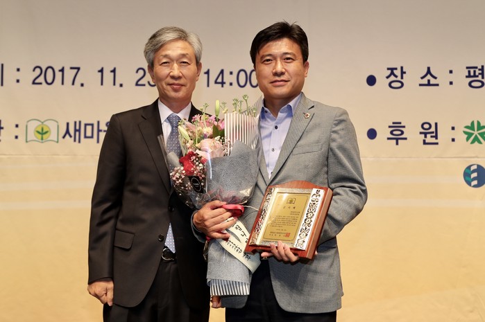 | ▲ 대전시의회 김종천(오른쪽) 의원이 새마을 독서문화 운동 기여 공로 감사패를 받고 기념촬영을 하고 있다. |
