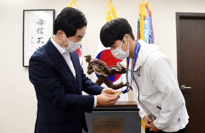 [세계로컬타임즈 신선호 기자] 의정부시는 31일 제50회 대통령배 전국 시·도 복싱 대회에서 우수한 성적을 거둔 효자고 3학년 전승현 선수를 격려했다.