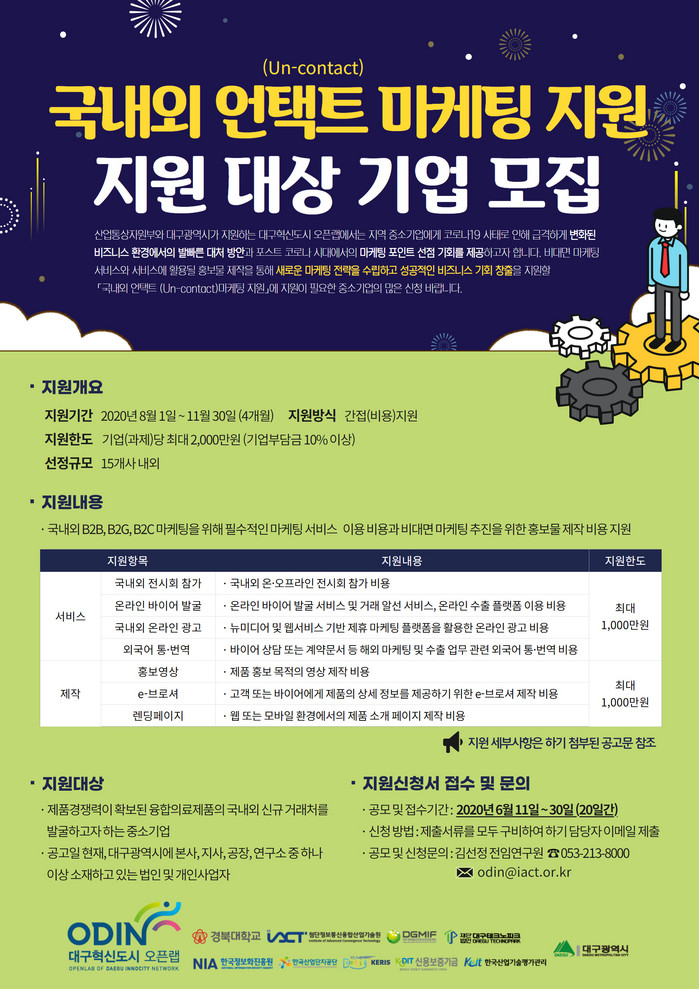 신청대상은 제품경쟁력이 확보된 융합의료(의료기기·웰니스)제품의 언택트 마케팅을 추진하고자 하는 대구지역 중소기업은 가능하다. 선정된 기업에게는 국내외 B2B · B2G · B2C 비대면 마케팅을 위해 필수적인 마케팅 서비스이용 비용과 비대면 마케팅 추진을 위한 홍보물 제작비용을 지원한다.