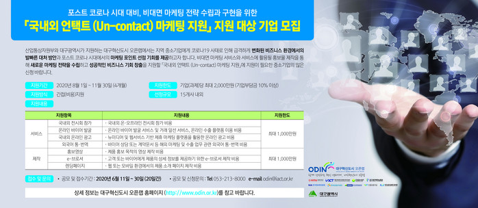 코로나19 팬데믹 이후 마케팅 트렌드가 전 세계적으로 비대면(Un-contact)·온라인(On-contact) 중심으로 급변하고 있다. 대구시는 이에 맞게 지역 중소기업이 효과적으로 대응하고 이후 산업을 선도할 수 있는 역량 확대를 위해‘국내외 언택트 (Un-contact) 마케팅 지원’ 프로그램을 마련한 것이다.