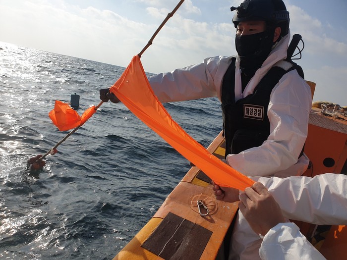 | ▲목포해경 해상특수기동대가 어선의 명칭, 어선번호 등이 미표기된 부표 및 깃대를 확인하고 있다.(사진=목포해경) |