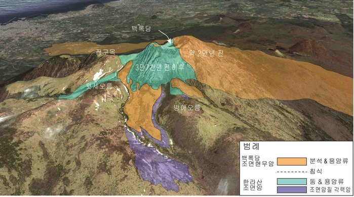 그리고 현무암질 용암의 연대는 용암층 하부의 고토양층 연대값 2만1000년과 지난 2016년 백록담 내부 퇴적층 가장 하부에서 얻은 1만9천년의 연대값을 함께 감안해 얻었다.