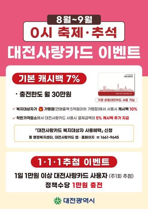 [세계로컬타임즈 민순혜 기자] 대전시는 8월 1일부터 9월 30일까지 두 달 동안 대전사랑카드 이용 활성화 및 소비 촉진을 위한‘대전사랑카드 0시 축제·추석 이벤트’를 추진한다.