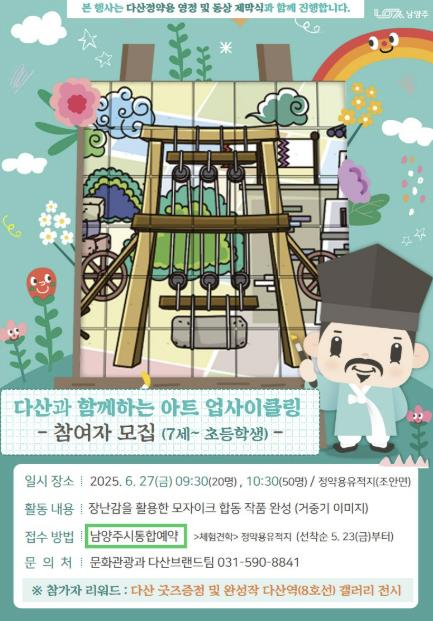 [세계로컬타임즈] 남양주시는 ‘아트 업사이클링 모자이크 합동 작품’ 활동에 참여할 학생 70명을 선착순 모집하고 있다고 26일 밝혔다.