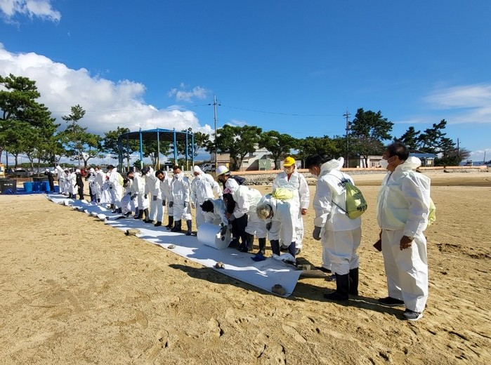 | ▲ 지난해 10월 해안방제 합동훈련 당시 해양자율방제대원들이 해양폐기물을 릴레이 처리하는 장면(사진=목포해경) |