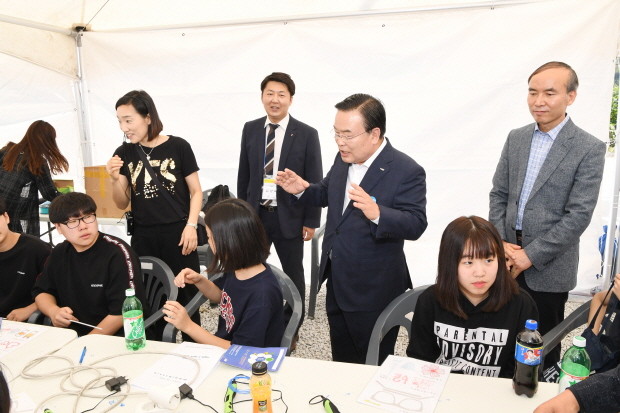 | ▲ 이성호 양주시장(오른쪽 세번째)이 지난 2일 경기섬유종합지원센터에서 열린 제4회 양주시 청소년 진로박람회’에 참석해 청소년들을 격려하고 있다.<사진제공=양주시청> |