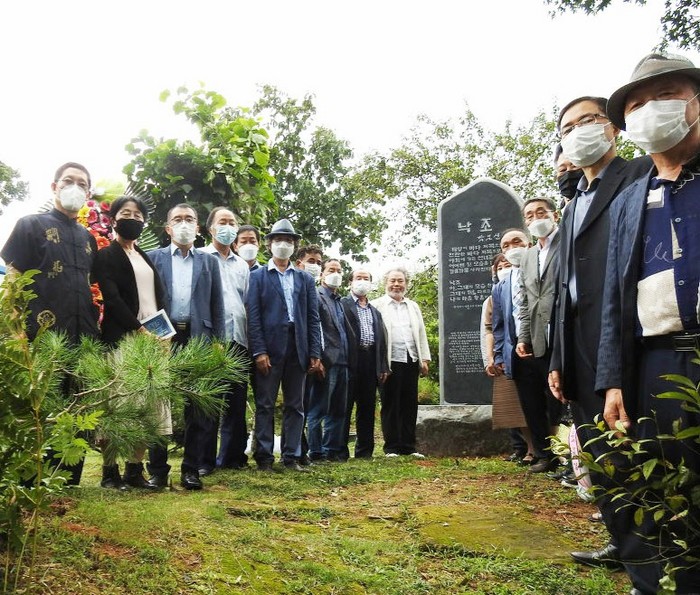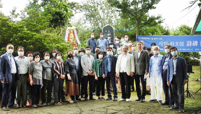| ▲향토시인 故 박문신 시비 제막식 후 기념촬영을 하고 있다. (사진=충남문인협회 제공) |