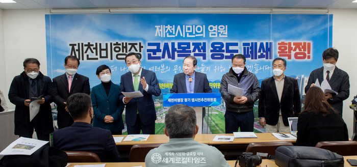 [세계로컬타임즈 김병호 기자]제천비행장 찾기 범시민추진위원회(이하 범시민추진위, 위원장 송만배)는 2일 제천시청에서 기자회견을 열고 제천비행장의 군사목적 용도 폐쇄가 확정됐다고 밝혔다.