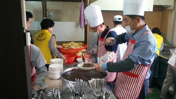 | ▲ 17일 충북도 북부출장소 직원들이 제천시 명동 무료급식소인'부부사랑터'에서 무의탁 노인 등에게 자장면 무료급식 봉사활동을 진행하고 있다.<사진제공=충북도 북부출장소> |