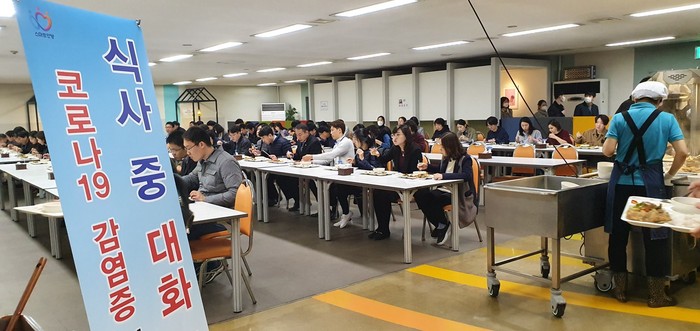 구내식당 좌석은 모두 360석, 양옆으로만 앉게 되는 관계로 직원들을 3개 조로 분산, 조별 30분 단위로 식당을 이용해야 한다.