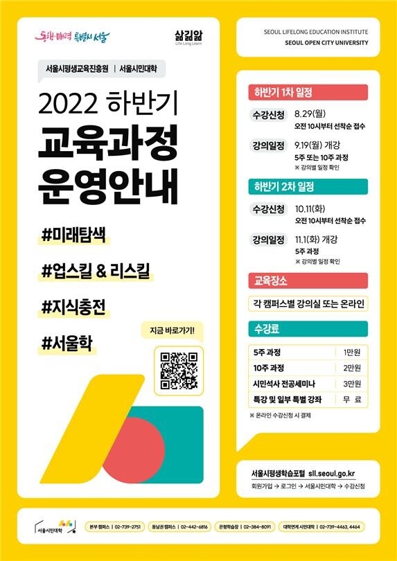 [세계로컬타임즈 이효진 기자] 서울시민 누구에게나 열린 시민종합교양대학, 서울시민대학이 오는 29일부터 2022년 하반기 교육과정 수강생을 모집한다.