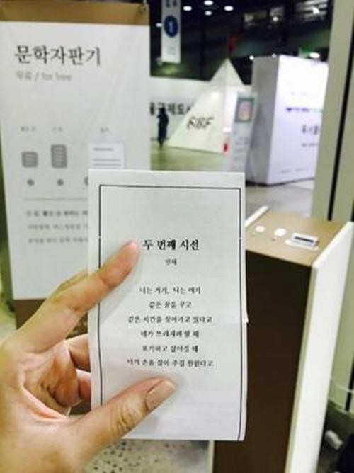 문학자판기는 '짧은 글' 버튼과 '긴 글' 버튼 중 하나를 누르면 문학작품의 명구절이 인쇄돼 나오는 서비스로 윤동주 시인의 '자화상'부터 생텍쥐페리의 '어린왕자'까지 소설과 시, 명언, 수필 등 1천여 편을 만날 수 있으며 매달 새롭게 작품이 업그레이드돼 서비스할 예정이다.