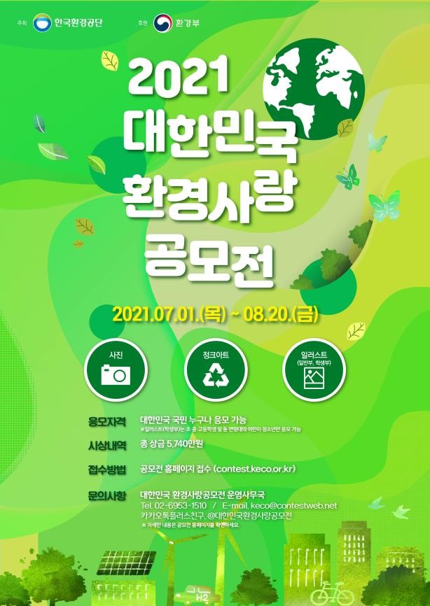 [세계로컬타임즈 이호 기자] 한국환경공단은 ‘2021 대한민국 환경사랑공모전(이하 공모전)’을 개최하고, 7월 1일부터 8월 20일까지 작품을 접수한다.