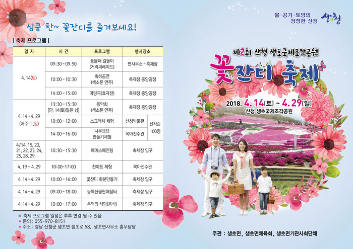 이번 축제는 생초면과 생초면 체육회, 기관사회단체가 주관하는 행사로 ‘꽃잔디의 향연, 화려함으로 물들다’라는 슬로건 아래 오감 만족의 다양한 볼거리로 14일부터 29일까지 16일간 진행된다.
