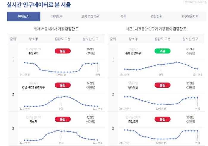 서울 명소의 실시간 인구를 추정한 ‘서울 실시간 인구 데이터’는 추정인구와 함께 혼잡도를 제공하며 인공지능(AI) 기반의 향후 12시간 예측인구를 제공한다.