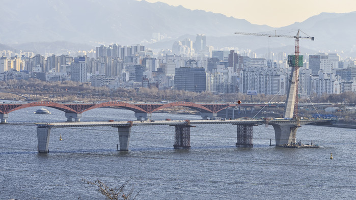 또 PSC 거더는 하부지지를 위한 가시설 설치가 불가한 한강 상 교하공간을 확보하기 위해 특수장비인 이동식 작업차(Form Traveler)를 이용해 거더 양쪽의 균형을 잡아가면서 교량을 이어 나가는 FCM(Free Cantilever Method)공법이 적용됐다.