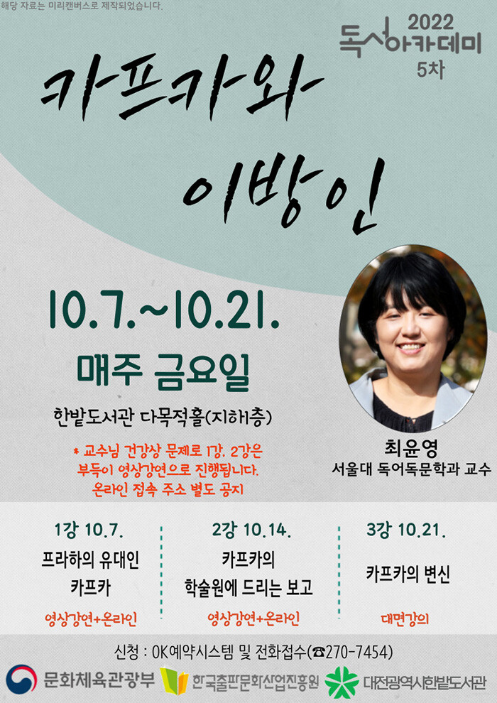 5차 강연은 최윤영 서울대학교 독어독문학과 교수를 초청해 ‘카프카와 이방인’을 주제로 진행되며, 10월 7일, 14일, 21일 금요일 10시부터 2시간씩 3회 일정으로 한밭도서관 다목적홀에서 열린다.