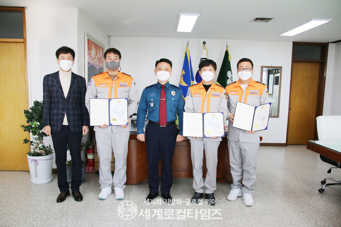 [세계로컬타임즈 김병호 기자]제천경찰서(서장 이동환)는 24일 경찰서장실에서 청풍호에 침수된 차량 인양에 도움을 준 민간잠수사 3명에 대해 경찰업무에 협조한 유공으로 감사장을 수여했다.