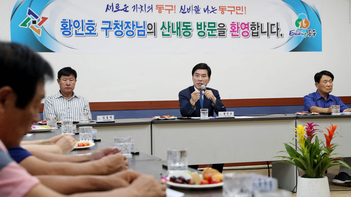 | ▲ 황인호 대전 동구청장(가운데)이 17일 16개동(洞) 중 하나인 산내동 주민센터를 첫 방문해 새로운 가치 동구의 변화에 대해 설명하고 있다. |