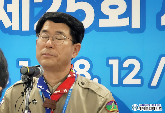 | ▲3일 오전, 잼버리 3일차 브리핑을 갖고 있는 최창행 2023 새만금 제25회 세계스카우트 잼버리 조직위 사무총장 ⓒ조주연 기자 |