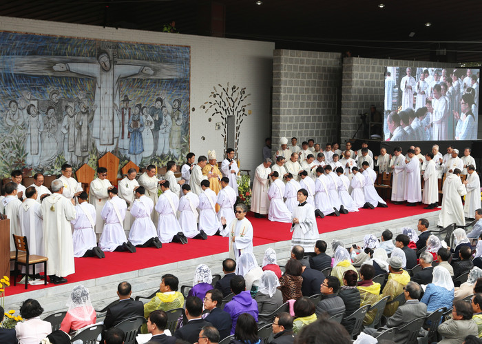 | ▲ 충남 당진시 솔뫼성지에서 지난 3일 대전교구 소속 부제 15명과 수도회 소속 부제1명이 사제서품을 받고 있다. |