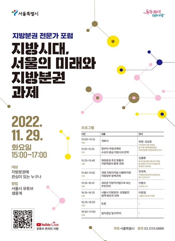 포럼은 서울시 유튜브에서 생중계되며, 국정과제와 지방분권, 균형발전에 관심 있는 누구나 온라인으로 참여가 가능하다.