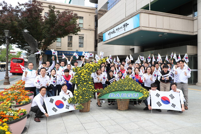 | ▲ 대구시 직원들이 10월 25일 ‘독도의 날’을 맞아 태극기를 들고 독도 사랑·영토 수호 의지를 다지고 있다. (사진=대구시 제공) |