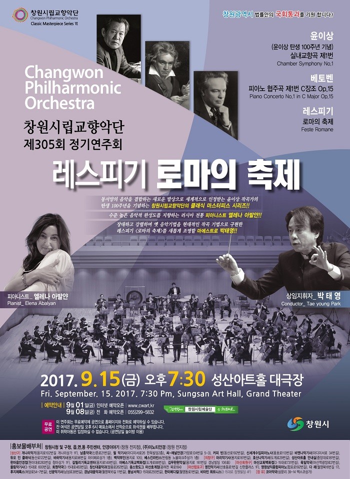 13일 창원시에 따르면 이번 공연은 상임지휘자 박태영의 지휘로 현대음악 작곡가 윤이상(1917~1995)의 ‘실내교향곡1번’과 레스피기(1879-1936, O.Respighi)의 ‘로마의 축제’, 그리고 러시아 피아니스트 엘레나 아발리안(Elena Abalyan)의 협연으로 베토벤 ‘피아노협주곡 1번’을 연주한다.