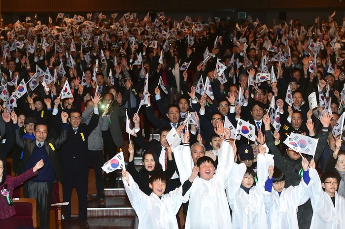 | ▲ 11일 인천 문화예술회관에서 열린 ‘제100주년 대한민국임시정부수립 기념식’에 참석한 시민들이 만세를 부르고 있다.(사진=인천시 제공) |
