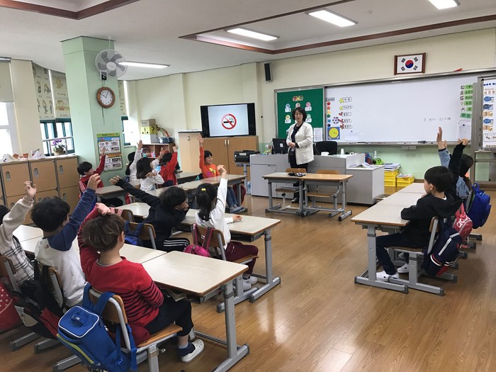 | ▲ 서귀포보건소 관계자가 초등학교 어린이들을 대상으로 흡연 예방교육을 진행하고 있다.<사진제공=서귀포시청> |