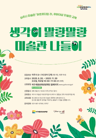 현재 여주시 내 6~7세 유아 단체(회당 15명)를 대상으로 참가자를 모집 중이며, 교육은 총 25회에 걸쳐 진행된다. 신청은 8월 6일 오전 10시부터 네이버 예약을 통해 가능하며, 참가비는 전액 무료다. 예약 및 운영에 대한 자세한 사항은 여주세종문화관광재단 홈페이지를 통해 확인할 수 있다.