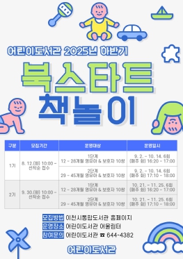 ‘북스타트 책놀이’는 영유아와 보호자가 함께 그림책을 읽고, 책과 연계된 다양한 놀이 활동을 통해 정서적 교감을 나누는 참여형 독서 프로그램이다. 어린이도서관은 유아기부터 자연스럽게 독서 습관을 형성하고, 보호자와의 긍정적인 상호작용을 도모하기 위해 매년 본 프로그램을 운영해오고 있다.