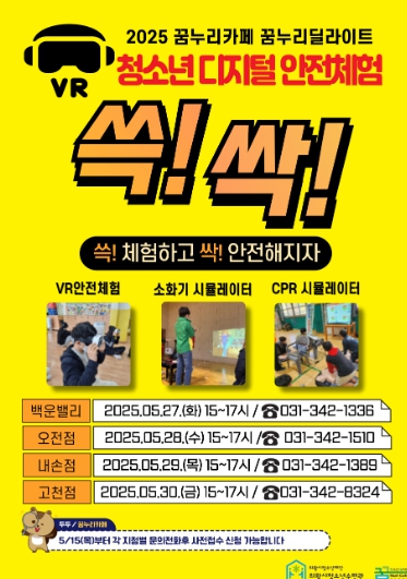 청소년 디지털안전체험“쓱!싹!”참여자 모집은 15일부터 마감시까지 진행되며, 신청은 꿈누리카페 4개 지점별 (고천점, 내손점, 오전점, 백운밸리점)로 전화 문의 후 방문 접수하면 된다.