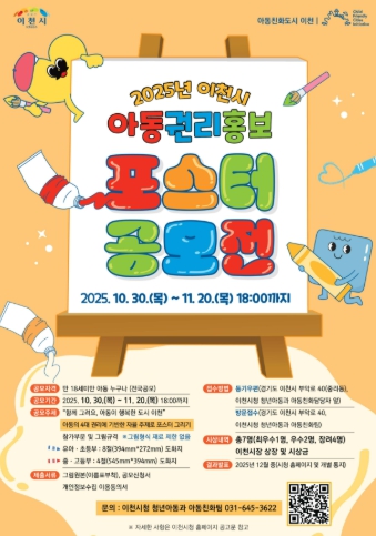 공모 주제는 ‘함께 그려요, 아동이 행복한 도시 이천!’으로 유엔아동권리협약에 명시된 4대 권리(생존권, 보호권, 발달권, 참여권)를 바탕으로 자유롭게 표현하면 된다. 연령과 거주지에 상관없이 18세 미만 아동은 누구나 참여할 수 있으며, 작품은 유아·초등부, 중·고등부로 나누어 심사한다. 심사 결과 총 7명을 선정해 이천시장 상장과 시상금을 수여할 예정이다.
