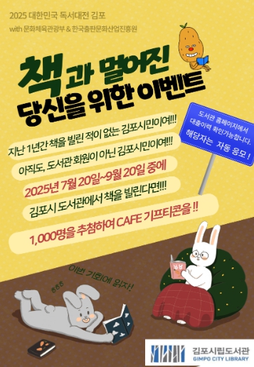 시는 본 행사 개최에 앞서, 책을 읽지 않는 시민들도 독서의 즐거움을 새롭게 발견할 수 있도록 돕기 위해, 오는 7월부터 ‘책과 멀어진 당신을 위한 이벤트’를 추진할 예정이다. 이번 이벤트는 ▲지난 1년간 도서관 대출 이력이 없는 김포시민이 ▲2025년 7월 20일부터 9월 20일까지 ▲도서관에서 책을 빌리면 자동 응모되며, 김포시는 해당 시민 중 천 명을 추첨하여 독서의 달인 9월 말, 카페 기프티콘을 증정한다. 물론, 해당 기간에 도서관 신규가입 시민도 자동 응모된다.