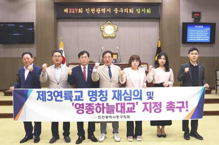 끝으로, 중구의회는 “‘영종하늘대교’라는 명칭이 하늘길의 출발점인 인천과 영종지역이 대한민국 관문으로서 갖는 위상과 브랜드 가치를 제고하는 데 큰 역할을 할 것”이라며 “18만 중구 주민들의 뜻을 모아 제3연륙교 명칭과 관련한 행정결정을 즉각 철회 및 재검토 할 것과 제3연륙교 명칭을 ‘영종하늘대교’로 지정할 것”을 강력히 촉구했다.