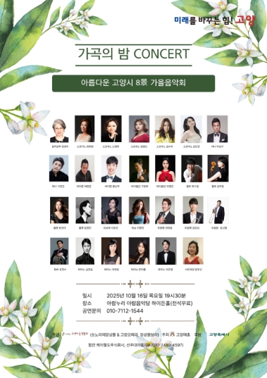 이번 공연은 우리 가곡과 클래식, 뮤지컬·영화음악 등 다양한 장르가 어우러진 가을 정취 음악회로, 성악·피아노·금관앙상블·관현악 등 다채로운 무대가 펼쳐진다. 무대마다 고양시의 아름다운 8경을 영상으로 담아 음악과 풍경이 조화를 이루는 감성적인 공연으로 꾸며질 예정이다..