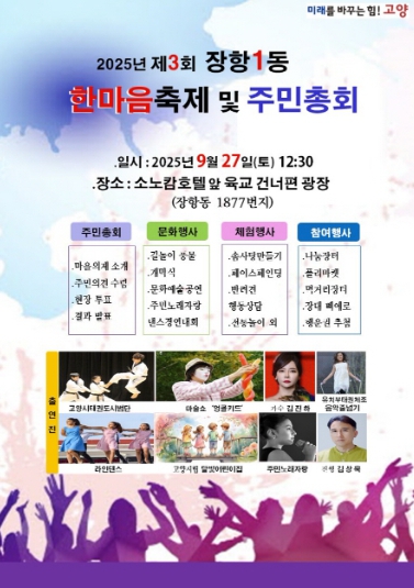 김동원 장항1동장은 “한마음축제는 지역 주민이 한자리에 모여 소통하고 화합하는 뜻깊은 시간이 될 것”이라며 “가족과 이웃이 함께하는 이번 축제에서 장항1동 공동체의 따뜻한 정을 다시 한번 느낄 수 있기를 기대한다.”고 전했다.