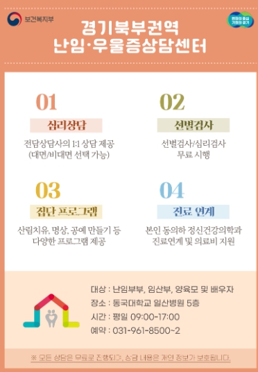 이용은 전화 또는 ‘경기북부권역 난임·우울증 상담센터’누리집으로 예약하면 된다.