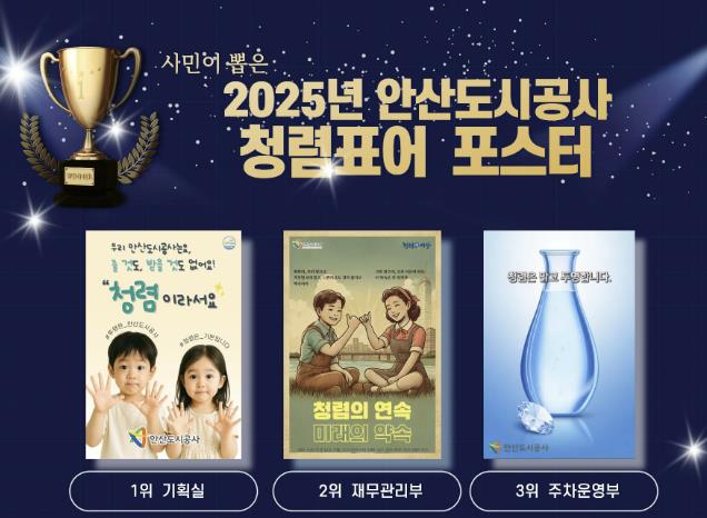 이번 공모전은 공사 내 각 부서가 청렴표어를 담은 포스터를 제작해 시민과 임직원의 투표로 우수작을 선정하는 한편, ‘청렴한 안산 만들기’에 대한 공감대를 형성하기 위해 마련됐다.