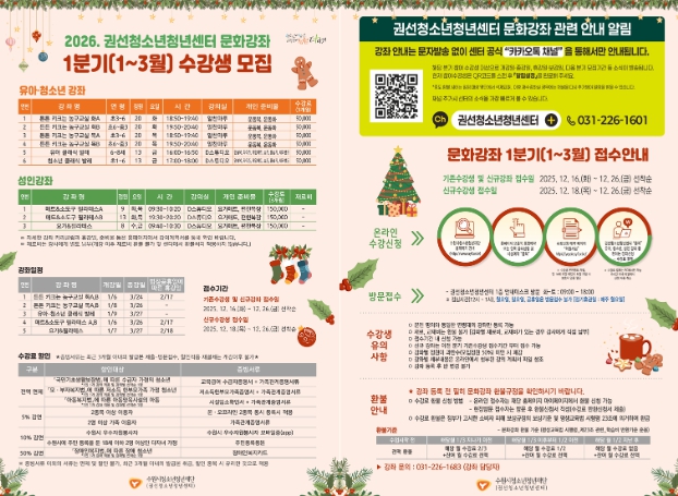 권선청소년청년센터 관계자는“수강생 수요가 높은 인기 강좌를 지속적으로 운영한 결과 기존 수강생의 만족도와 재수강률이 높았다”며, “많은 청소년과 지역주민의 관심과 참여를 기대한다”고 밝혔다.